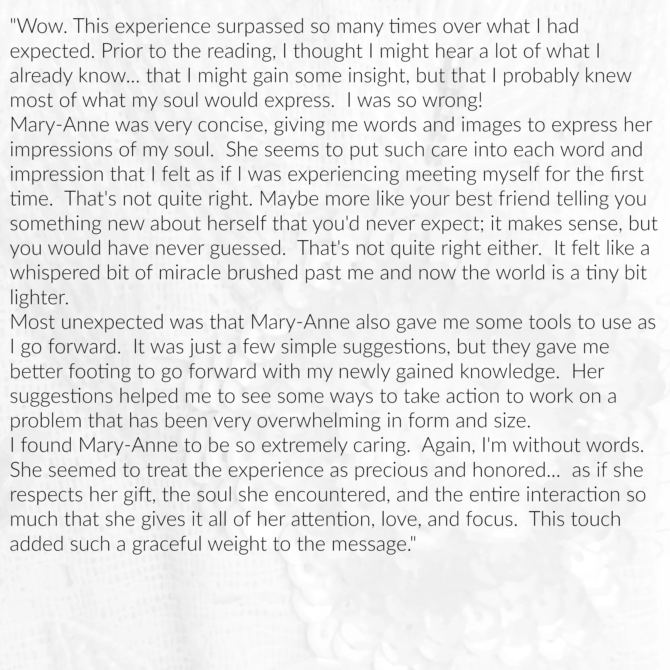 Please take a moment to read a few of the amazing testimonials that some of my clients so far have shared, they blew me away - just as each of my soul counseling sessions do, and I am so thankful for them all. I love what I do, I learn something valuable from each and every soul that I encounter and am always humbled by each connection. I hope that one day I will have the pleasure of connecting with you!